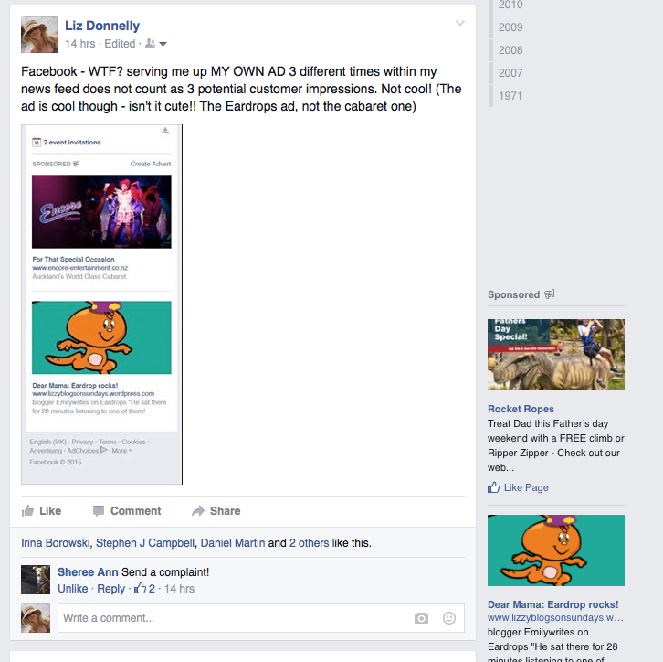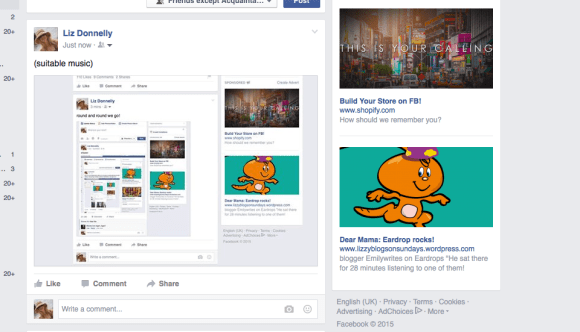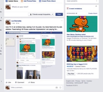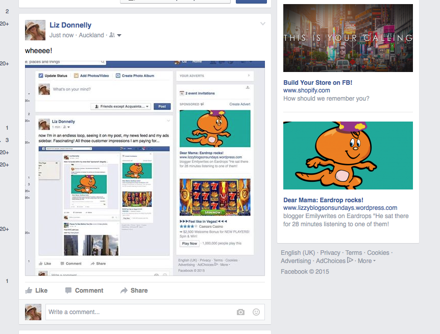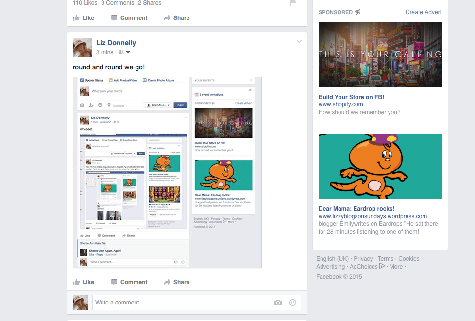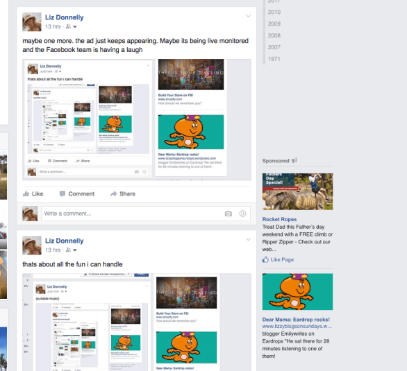 Every minute or so the ads alongside my news feed updated. And I kept seeing my own ad lined up against my posts talking about my own ad. So I started taking screenshots.