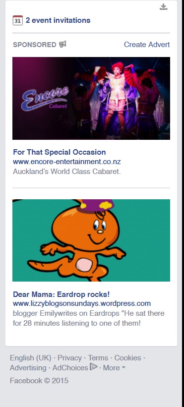 As some of you may know, I have a little home based business ‘Eardrops’ where I make and sell cool sounds stories for preschoolers. Every now and then (like once a year) when something really exciting happens like Emilywrites review of my CDs (woohoo!) I spend $30 on Facebook running a little ad campaign.