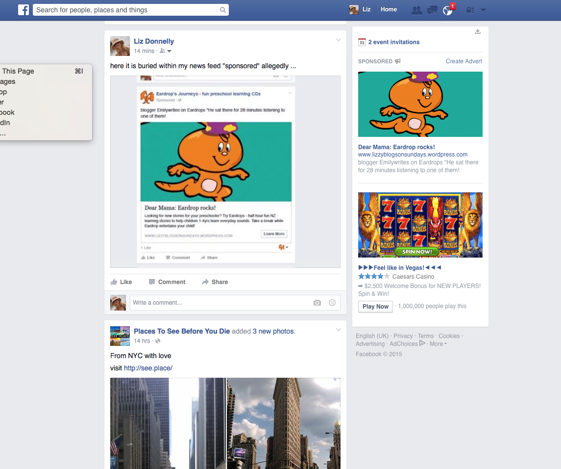 So, I was rather surprised and a little taken aback to see my own ad appear to the right of my own news feed as a ‘sponsored’ ad – and within my own news feed as a ‘sponsored’ ad. Not sure this should happen as I am the owner of the page and, for argument’s sake, probably not a new customer.