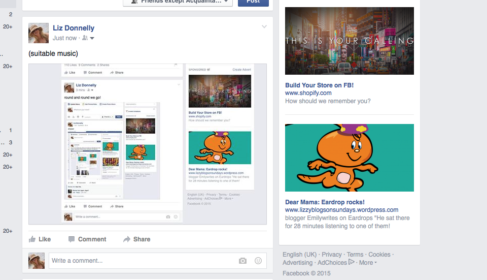 Some time later I logged onto my own Facebook account. Let me clarify here that my personal Facebook account manages my ‘Eardrops’ Facebook account – the 2 are linked.